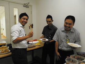 Kelihatan Shuhaimy dengan sataynya, di sebelahnya Ruzaimi dan di belakang kelihatan Rizal bersedia untuk menyerang makanan di atas meja. Ketiga-tiga mereka adalah 'orang kuat' kami di HAT TM.